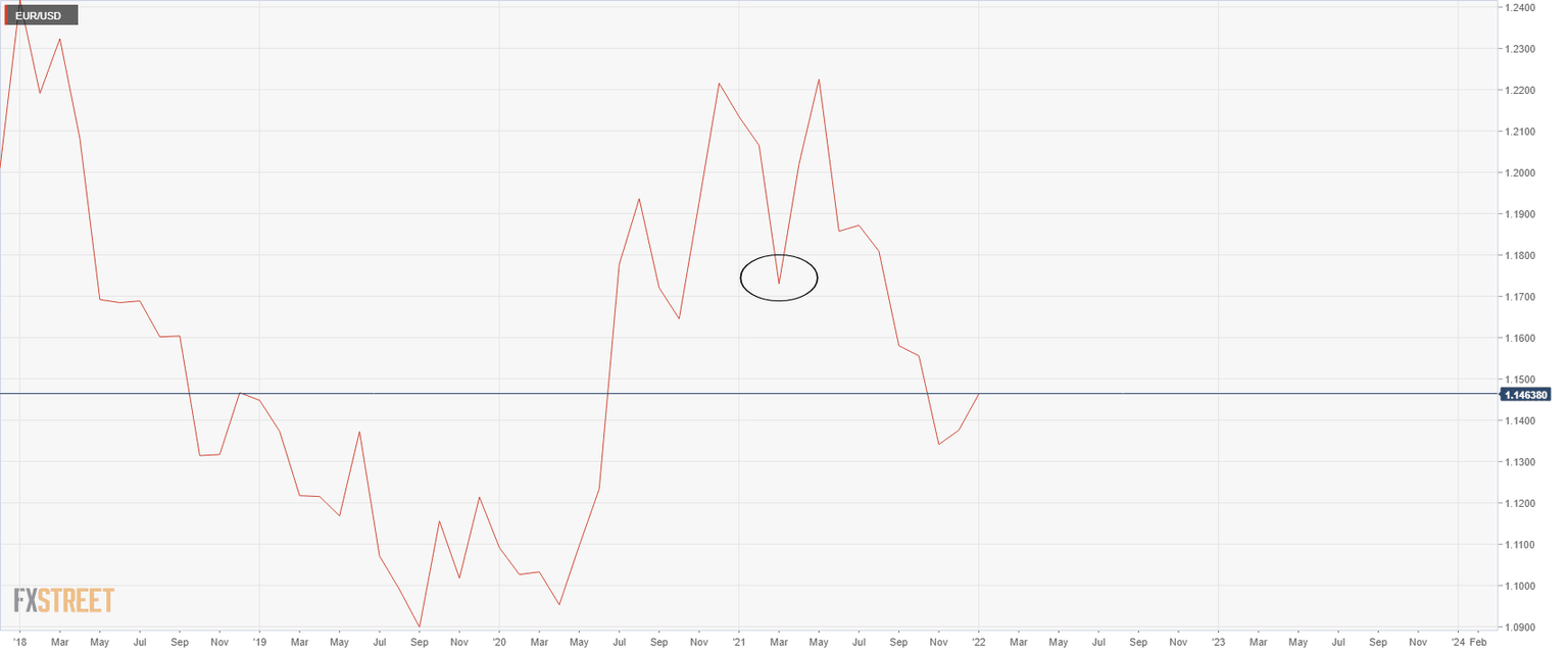 The price of EUR/USD is leaving a monthly M-formation which is seen with ease on the line chart for which is a reversion pattern. The price would be expected to revisit the neckline of the formation, in which case in the above illustration is identified near 1.1730.