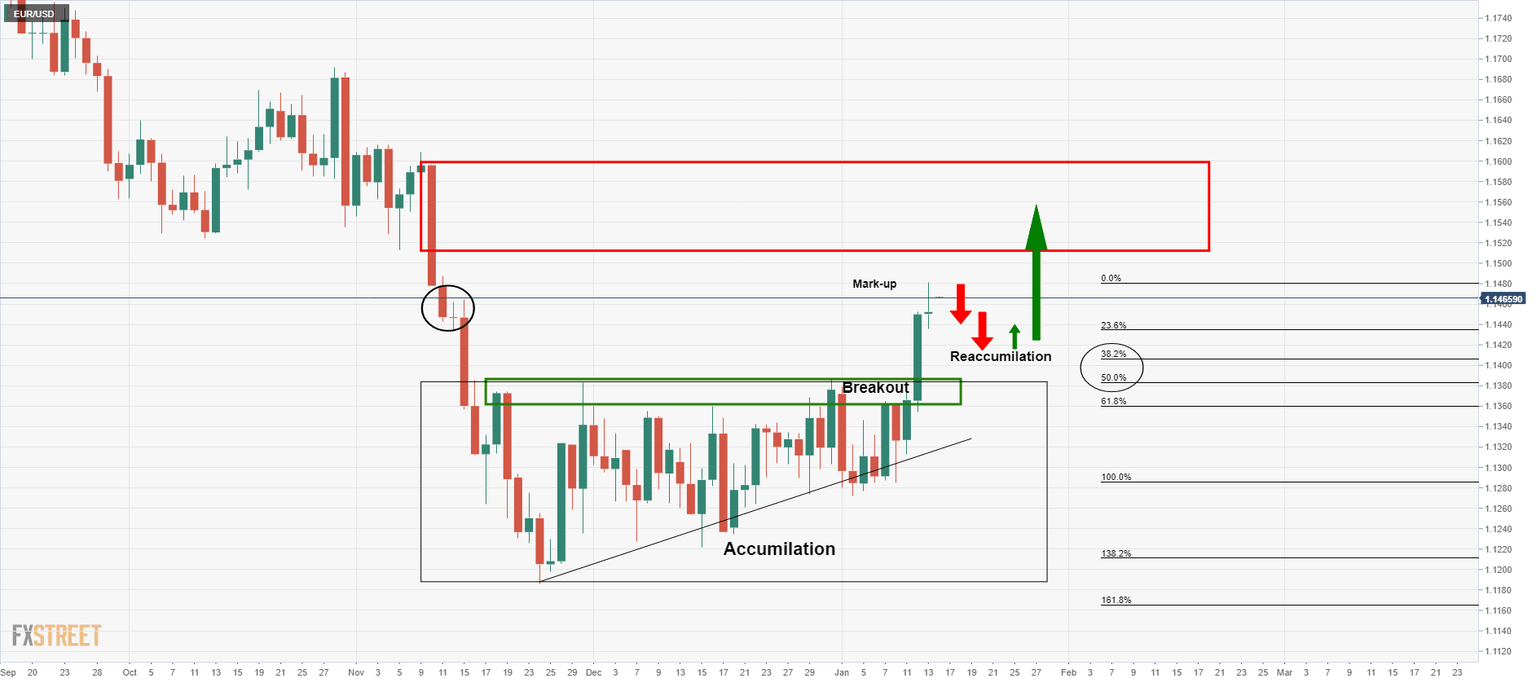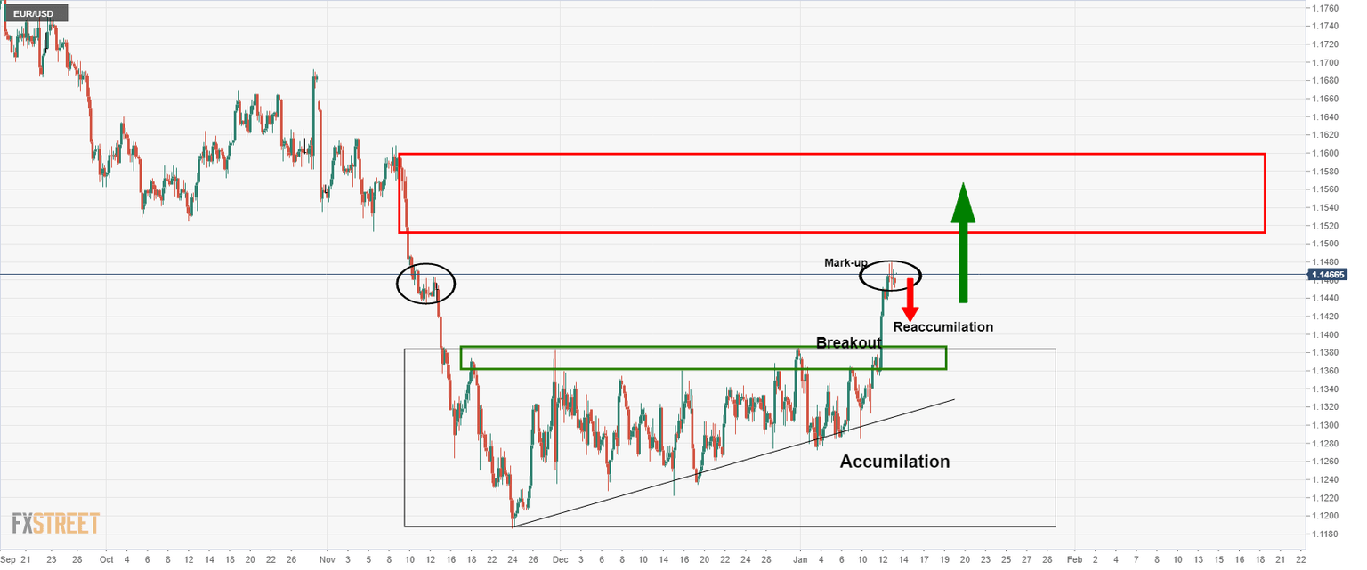 The 4-hour chart shows a period of accumulation that has recently seen a breakout, termed as the ''mark-up''. There is only so far that the price can rally before it meets sellers and should the buyers move in at a discount, then the price would be expected to ''accumulate'' and move higher to mitigate the next imbalance of price towards the monthly M-formation's neckline.
