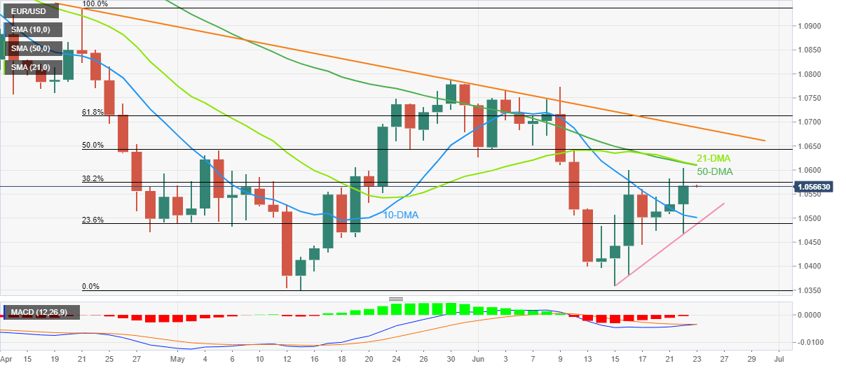 EUR/USD bulls take a breather around 1.0570, following a three-day uptrend, as traders await the preliminary PMIs for June month from Eurozone and the US during early Thursday.