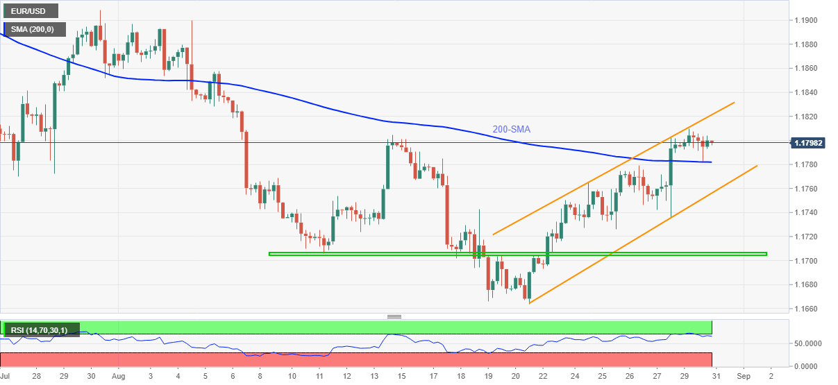 EUR/USD treads water around 1.1800 despite refreshing multi-day high at the week’s start. In doing so, the major currency pair remains inside an ascending trend channel formation established since August 20.