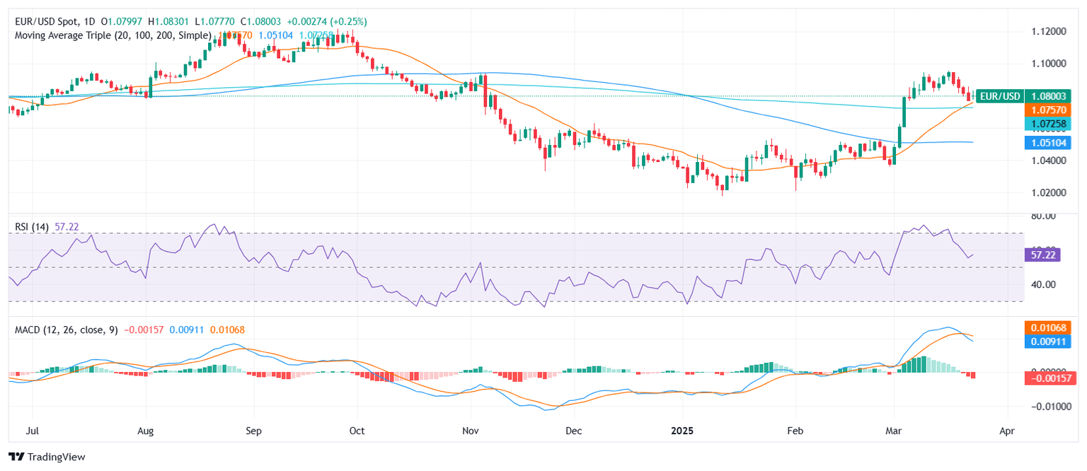 The EUR/USD pair was seen trading around the 1.0800 area during Tuesday’s session after the European close, holding modest gains on the day. Despite a subdued intraday range, the overall outlook remains bullish as the pair sits comfortably above its key moving averages. Momentum indicators remain mixed, suggesting limited short-term conviction, yet broader trend signals support the bullish bias.