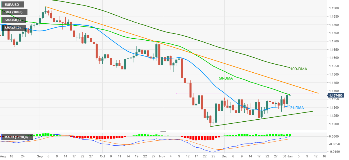 EUR/USD bulls attack crucial resistance around 1.1385, poking the highest level since mid-November, during the early Asian session on Monday. That said, the quote flashes 1.1375 level by the press time.