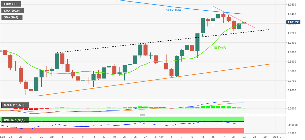 EUR/USD prints mild gains around 1.0320 as buyers keep the previous day’s rebound from a one-week low during early Wednesday.