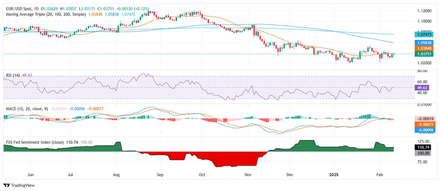 The EUR/USD pair edged higher to 1.0375 on Wednesday, as buyers extended their recent recovery efforts. However, the rally met resistance at the 20-day Simple Moving Average (SMA), a key technical barrier that has previously dictated short-term direction. The pair’s ability to consolidate above this level could determine the next major move.