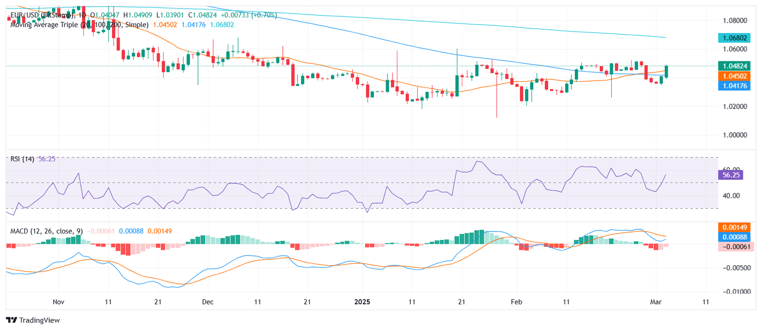EUR/USD kicked off the week with a solid rally rising past 1.0450, climbing above key technical levels and suggesting that buyers are regaining momentum. The pair decisively broke through the confluence of the 20-day and 100-day Simple Moving Averages (SMA), reinforcing a shift in sentiment. This move comes after last week's struggle around these levels, where sellers had temporarily kept the pair in check.