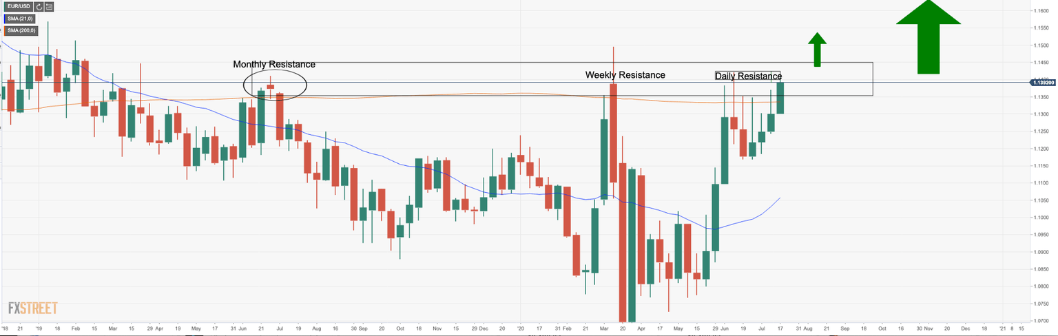 EUR/USD is showing signs of a bullish nature, although the price is likely to struggle as daily highs and weekly/monthly structure.