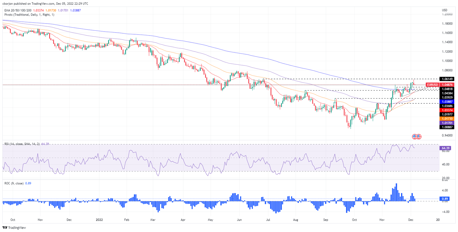 On Monday, the EUR/USD stumbled from around 1.0594 due to some factors, including positive economic data from the United States (US), and high US Treasury yields, amidst China’s easing Covid restrictions. At the time of writing, as the Asian Pacific session begins, the EUR/USD is trading at 1.0488.