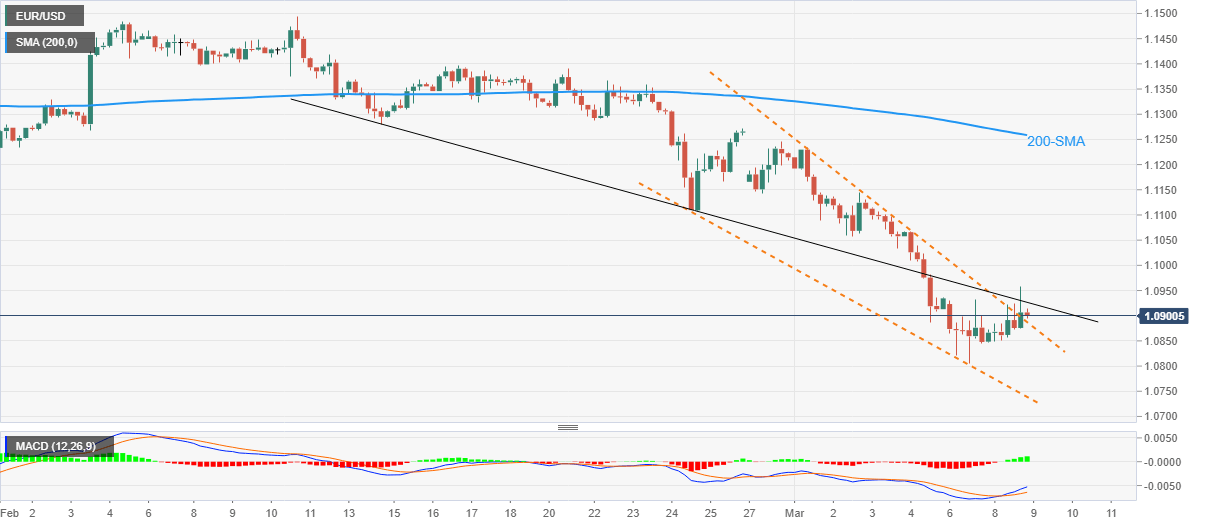 Even so, the resistance-turned-support line of a two-week-old falling wedge and bullish MACD signals keep EUR/USD buyers hopeful.