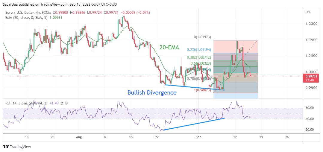 A recovery in the asset was followed by a sheer retracement, which has dragged the asset below 61.8% Fibo area. The marking of the retracement tool from September 6 low at 0.9864 to Monday’s high at 1.0198 displayed the placement of 61.8% Fibo retracement at 0.9994.