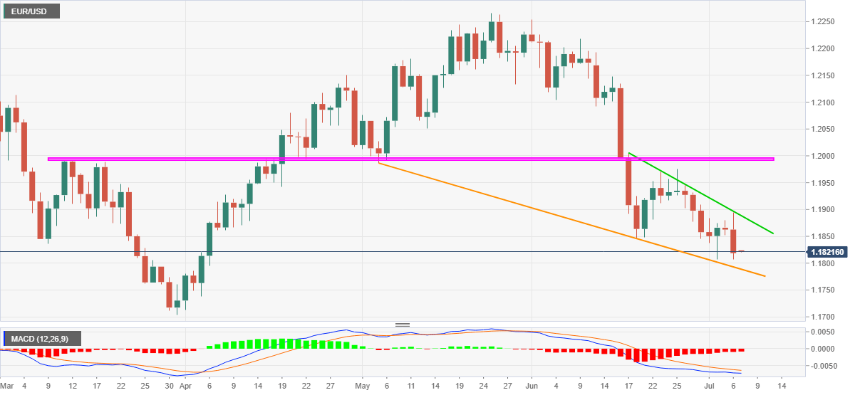 The downward trajectory also took clues from bearish MACD, suggesting further weakness towards a descending support line from May 05, around 1.1790-85. However, the 1.1800 threshold may offer an intermediate halt.