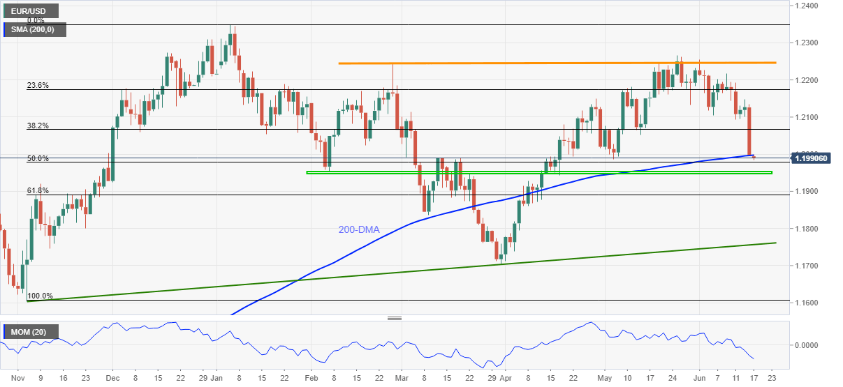 EUR/USD bears take a breather with mild losses around 1.1990, following the heaviest slump since March 2020, during Thursday’s Asian session. Even so, the quote remains below 200-day SMA (DMA) amid a downbeat Momentum line, suggesting further declines.