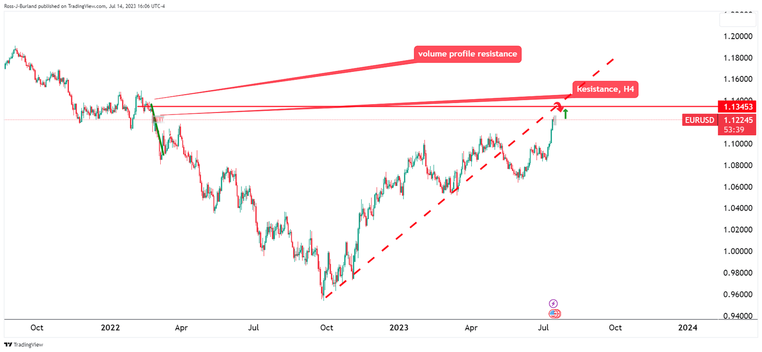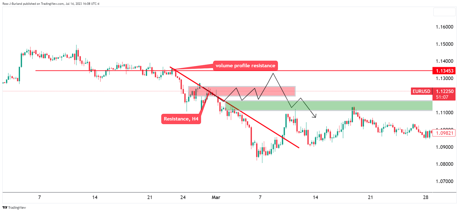 EUR/USD is stalling on the bid but underlying momentum is undeniable. At the time of writing the Single Currency is probing key resistance as the following illustrates, However, bears are planning their gameplay as the following charts will lean towards. Meanwhile, the US Dollar has bounced in a correction as markets crystallised the sentiment on the charts that the Federal Reserve is near the end of its rate hike cycle amid softening inflation.
