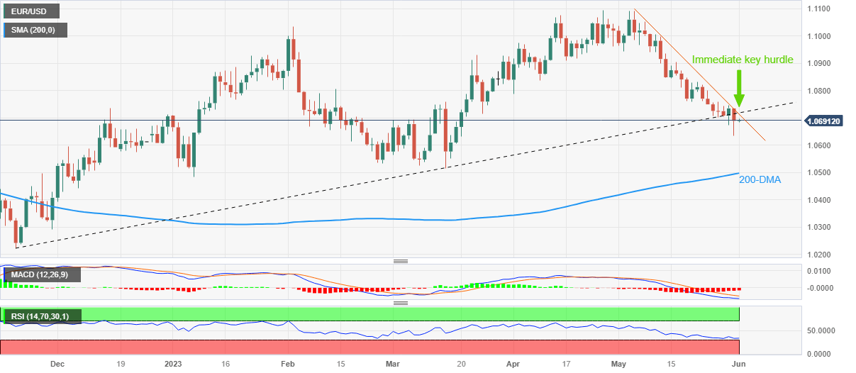 However, the bearish MACD signals join a convergence of the previous support line from November 2022 and a one-month-old descending resistance line, close to 1.0720 at the latest, to challenge the Euro bulls.
