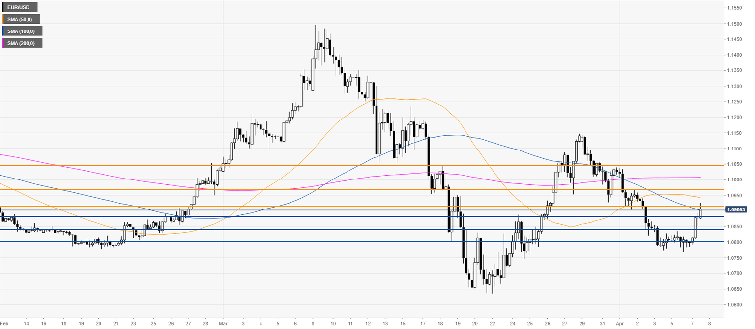 - EUR/USD is rebounding from the April’s lows while challenging the 1.0900 figure.