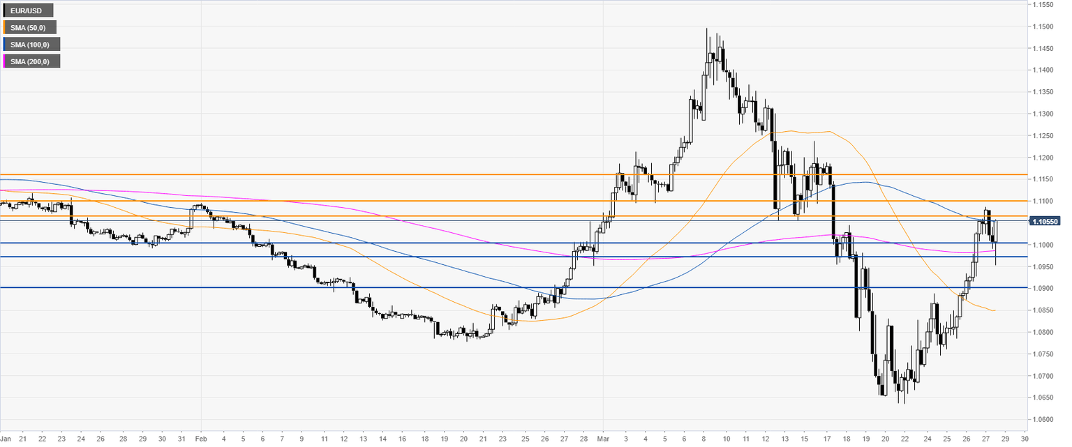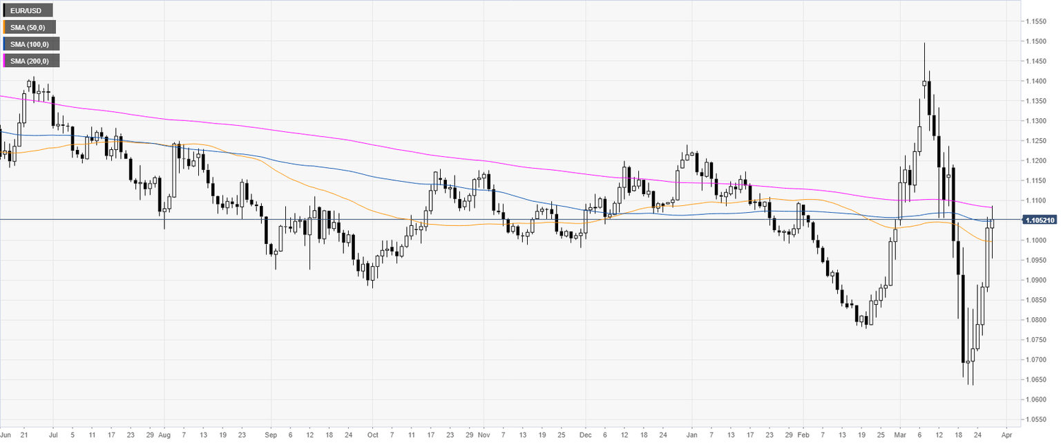 EUR/USD bounced sharply from the 2020 lows while challenging the main SMAs on the daily chart. This Friday the correction up seems to decelerate near the 200 SMA on the daily chart and below the 1.1100 figure.