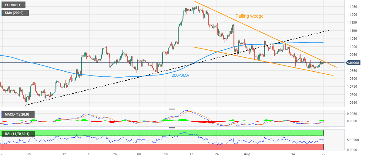 EUR/USD buyers flirt with the 1.0900 threshold within a one-month-long falling wedge bullish chart formation on early Tuesday.