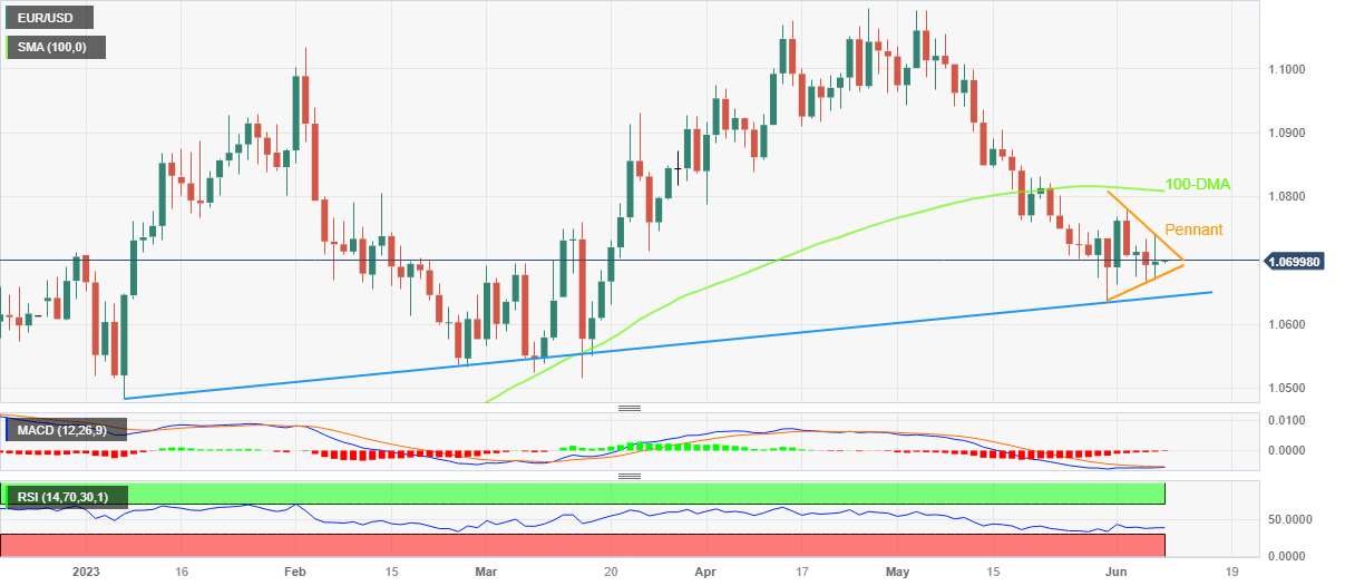 EUR/USD steadies within a one-week-old Pennant formation, near 1.0700 by the press time of early Thursday in Asia, as bulls and bears jostle amid fears of economic slowdown, higher rates and softer Eurozone data.