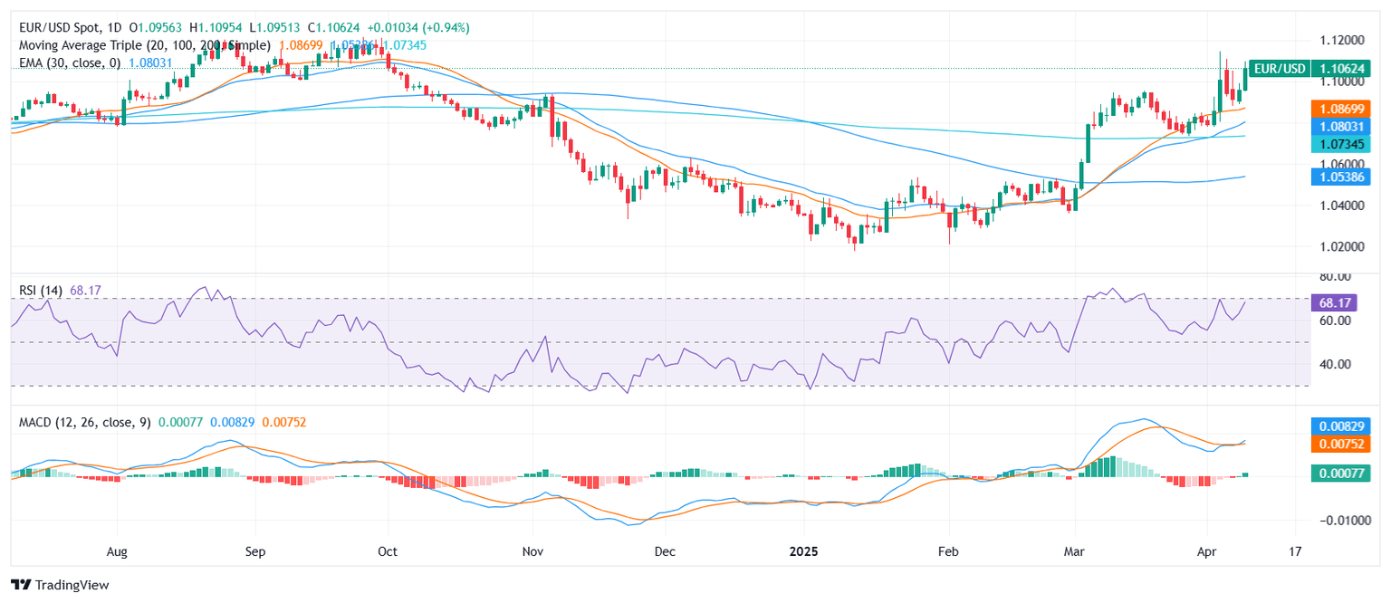 The EUR/USD pair extended its gains on Wednesday, moving higher after the European session and climbing toward the 1.1100 area. The pair sits above the midpoint of its daily range, buoyed by renewed bullish momentum despite some neutral short-term indicators. Today’s rise further supports the broader bullish outlook, which has been reinforced by strong moving average signals and a MACD buy trigger.