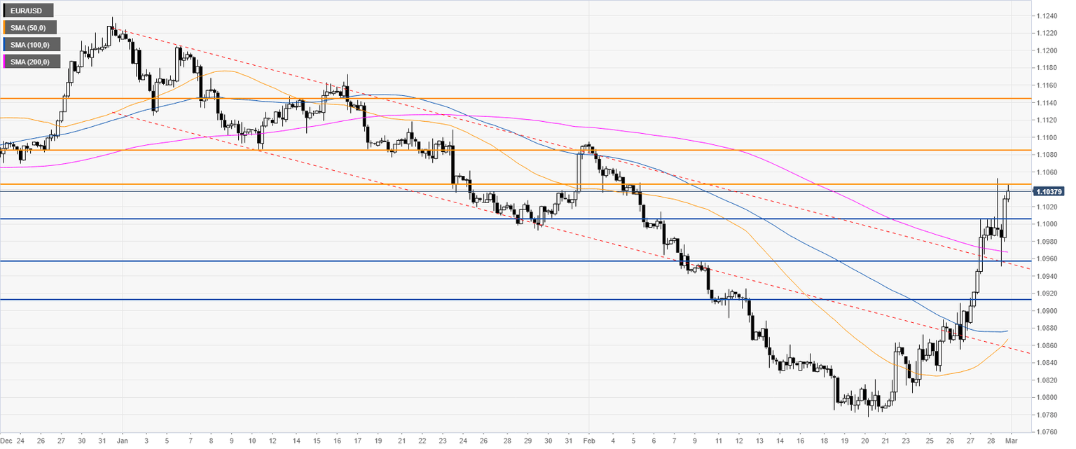 EUR/USD is challenging the 1.1047 resistance while above the main SMAs on the four-hour chart. The bulls stay in control suggesting that the greenback could extend its up move towards the 1.1085 and 1.1143 levels, according to the