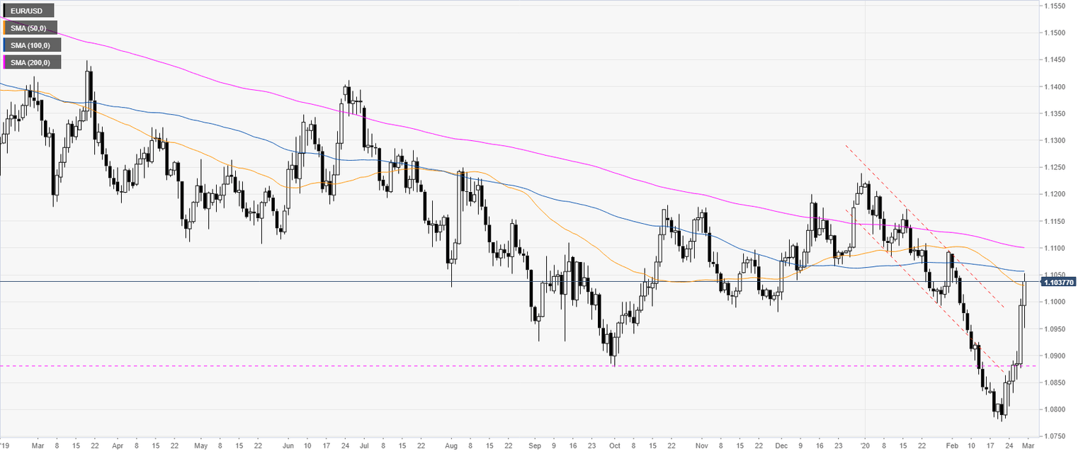EUR/USD is trading in a bear trend below the main daily simple moving averages (SMAs). However, the quote is sharply reversing up from 34-month lows while challenging the 50 and 100 SMA on the daily chart.