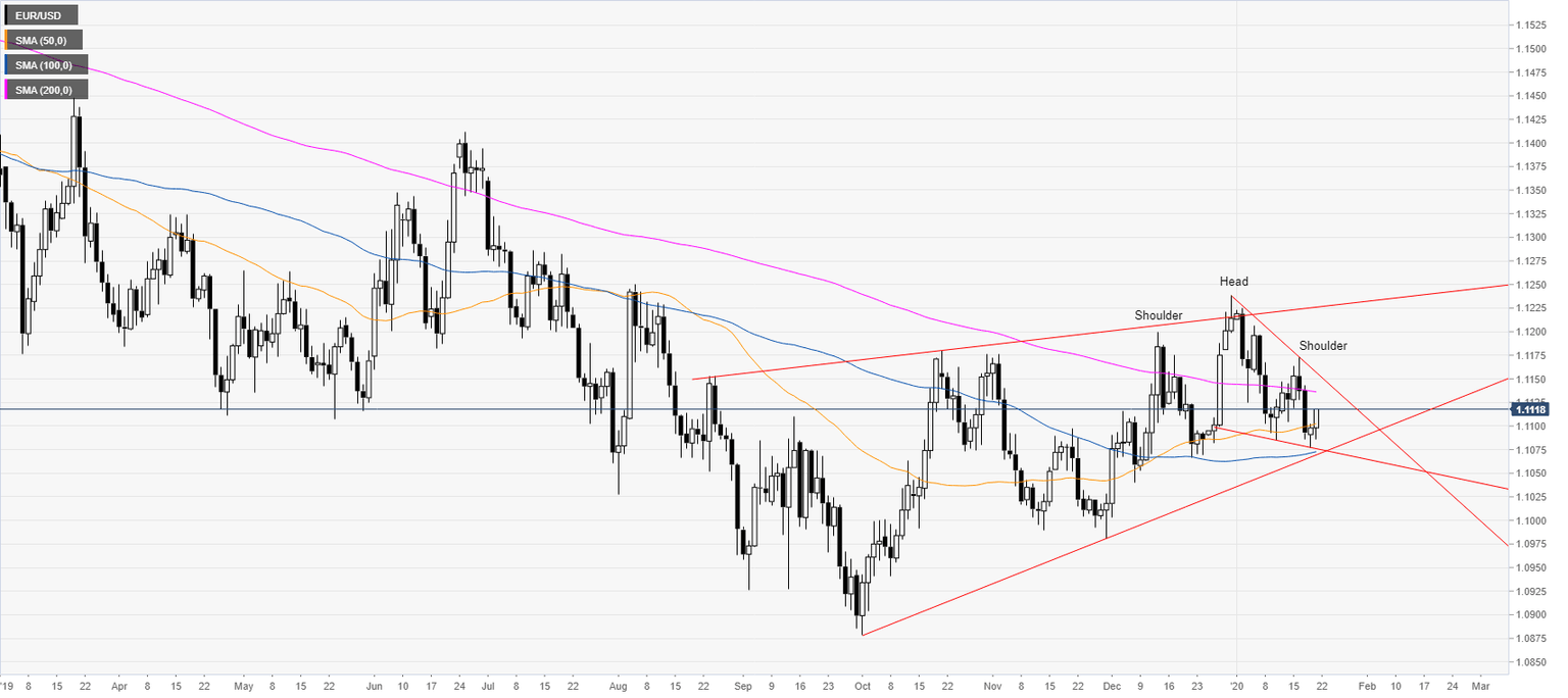 EUR/USD is trading in a weak bear trend below its 200-day simple moving average (SMA). However, EUR/USD is trading within a bullish channel originating from October 2019 and also within a bull flag since late December. The euro formed a head-and-shoulders pattern, therefore, a break above the right shoulder near 1.1175 and the 200 SMA can be seen as a bullish continuation signal. However, since the price action has been so two-sided in the last months of trading it is more likely that breakouts in either direction will not go very far.