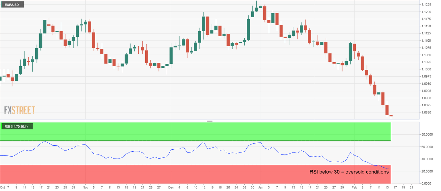 EUR/USD breached support at 1.0839 a few minutes before press time and fell to 1.0827, the lowest levels since April 2017.