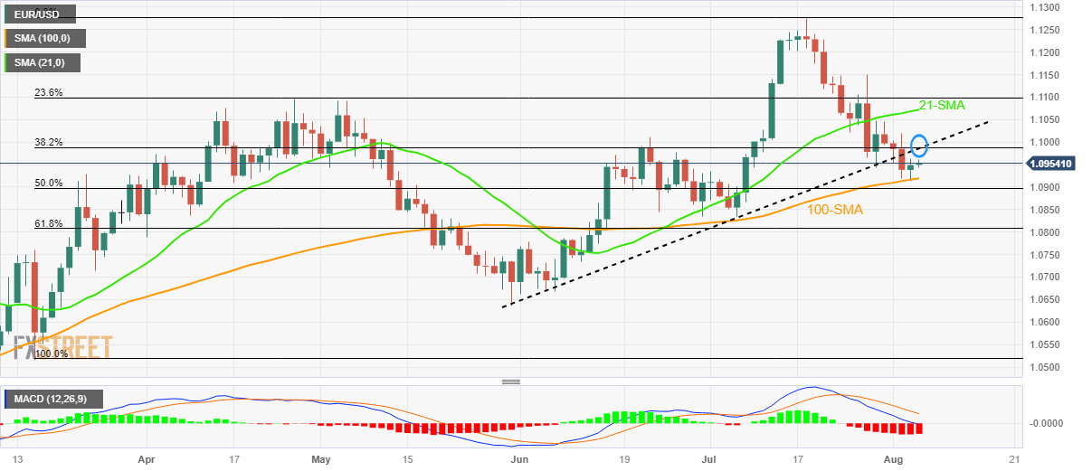 Technically, a convergence of the previous support line stretched from May 31 joins 38.2% Fibonacci retracement of March-July upside to highlight 1.0980 as an important challenge for the EUR/USD buyers.
