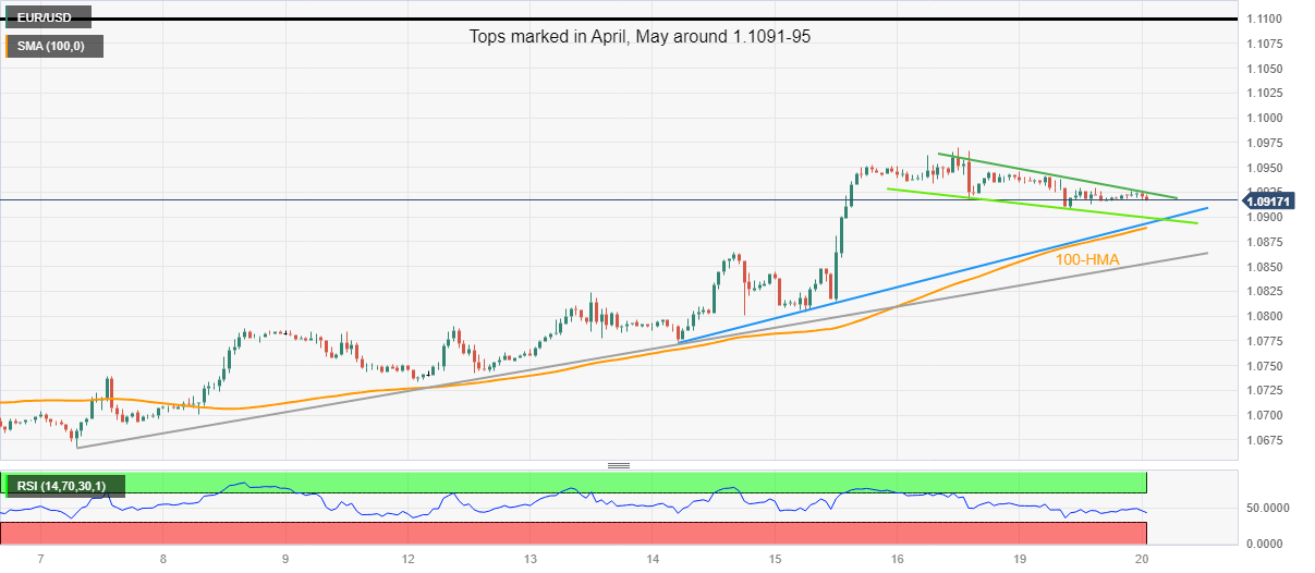 EUR/USD drops for the third consecutive day amid early Tuesday morning in Europe, refreshing intraday low near 1.0920 by the press time. In doing so, the Euro pair justifies the failure to cross the 1.0970-60 area in the last week, as well as a three-day-old falling resistance line.
