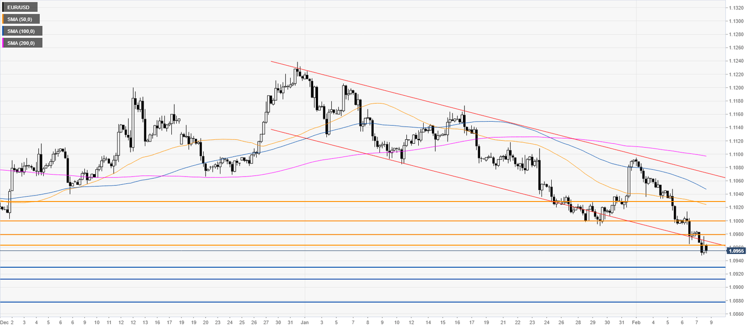 EUR/USD is trading in a bear channel below the main SMAs while bears are eying a break below the 1.0930 support. As the euro remains under heavy selling pressure, a break below the above-mentioned level is likely to lead to further declines towards the 1.0912 and 1.0877 levels, according to the