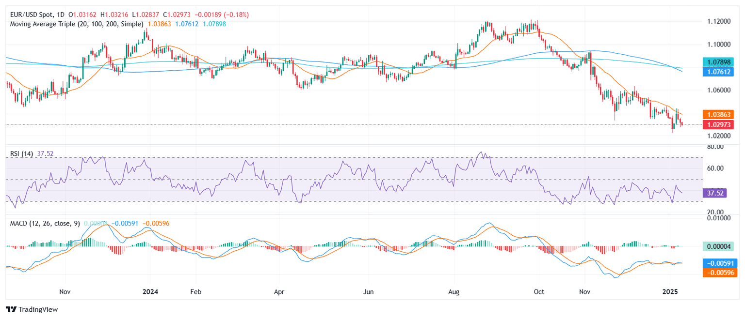 The EUR/USD pair continued its downtrend on Thursday, edging 0.18% lower to trade around 1.0305. This decline not only extends the losing streak to a third session but also underscores the pair’s struggle to establish a more robust recovery. Despite a brief bounce earlier in the month, the 20-day Simple Moving Average (SMA) remains out of reach, signaling that bullish momentum has yet to build meaningful traction.