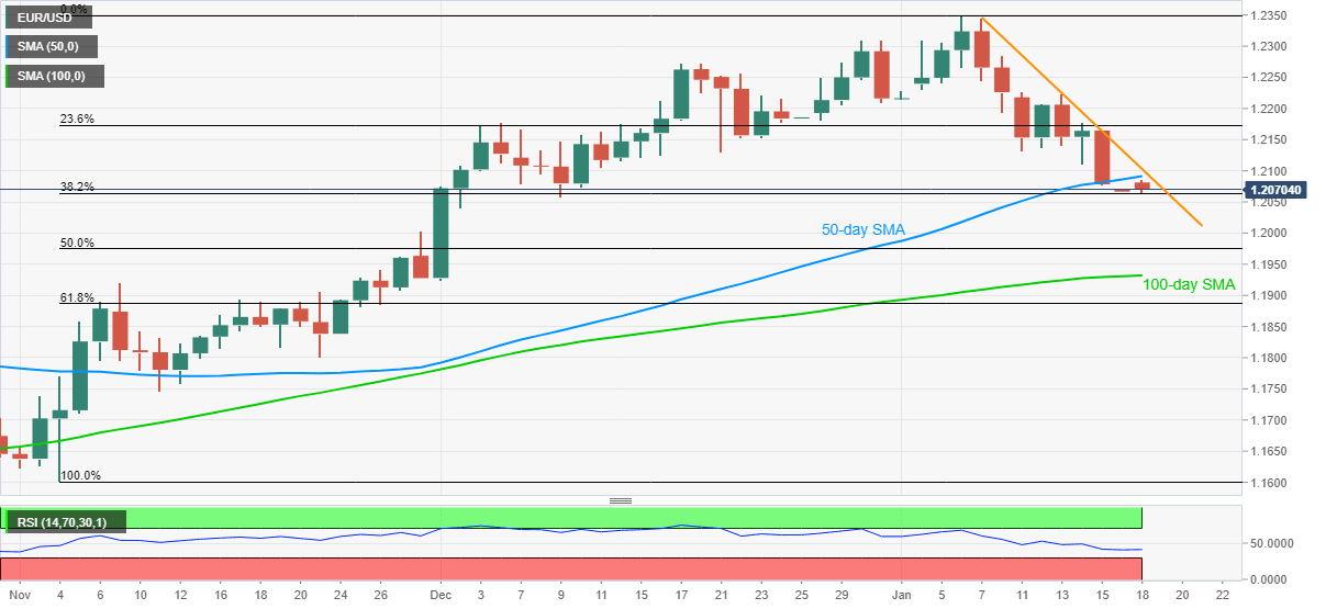 EUR/USD takes offers near 1.2065, down 0.10% intraday, during Monday’s Asian session. In doing so, the currency pair drops to the fresh low since early December 2020 while stretching Friday’s downside break of 50-day SMA.