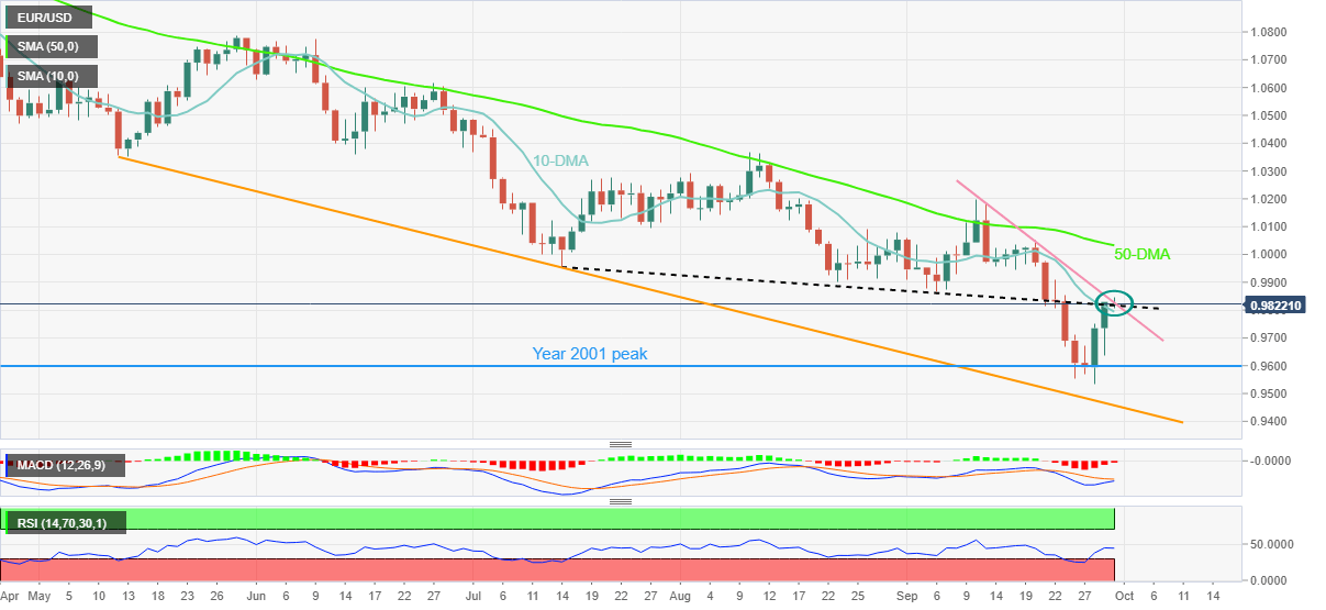 EUR/USD jostles with the key 0.9830 resistance confluence as bulls struggle to defend the first weekly gains in three during Friday’s Asian session.