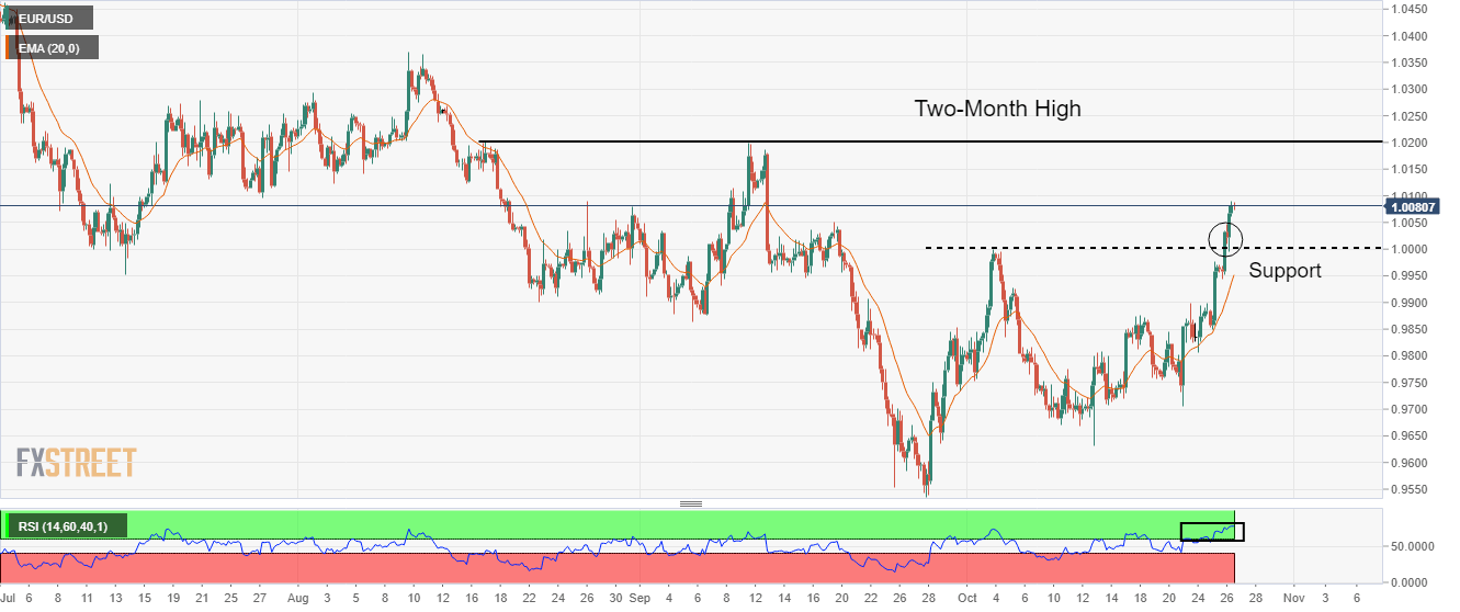On a four-hour scale, the shared currency bulls have strengthened after shifting their business above the horizontal support placed around October highs at parity, which has become a support now. Now, the euro bulls are eyeing to smash a two-month high at 1.0200 ahead.