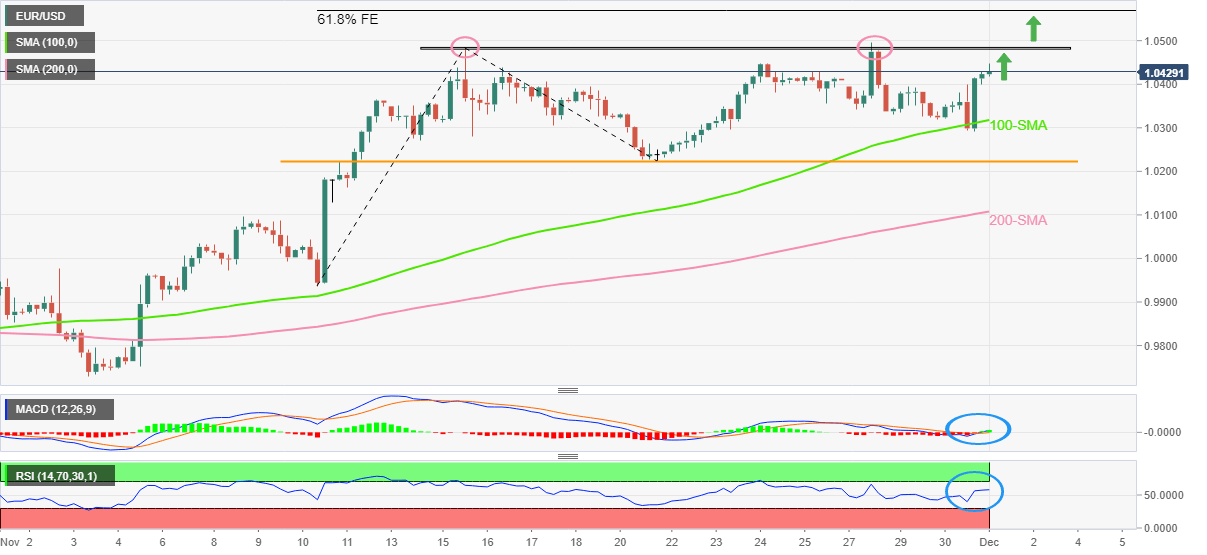 However, recent bullish signals on the MACD and steady RSI keep EU/USD buyers hopeful as they approach the 1.0480 key hurdle comprising the tops marked on November 15 and 28.