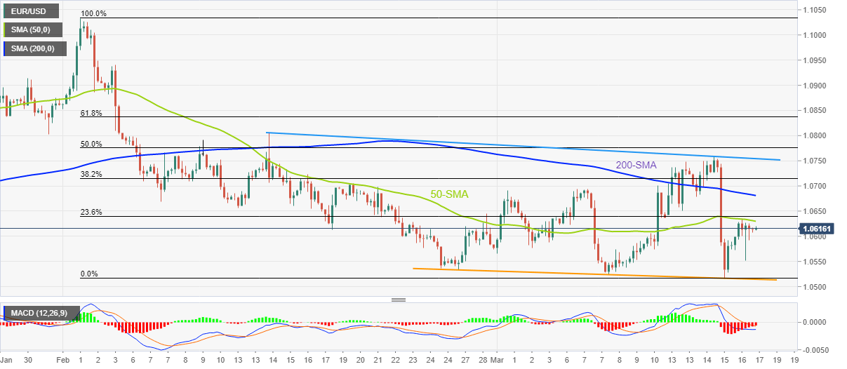 In doing so, the Euro pair struggles to extend the U-turn from a three-week-long support line, around 1.0515 by the press time, as the 50-bar Simple Moving Average (SMA) joins the bearish MACD signals to challenge the bulls.