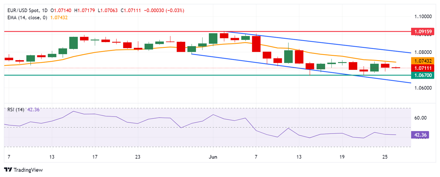 EUR/USD extends its losses for the second consecutive day, trading around 1.0710 during the Asian session on Wednesday. A technical analysis of the daily chart suggests a bearish bias for the pair, as it consolidates within the descending channel.