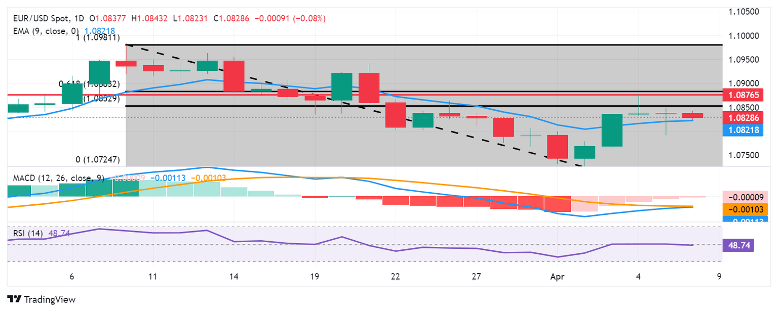 EUR/USD snaps its four-day winning streak, declining to near 1.0830 during the early European hours on Monday. The pair could move downward to retest the nine-day Exponential Moving Average (EMA) at 1.0822.