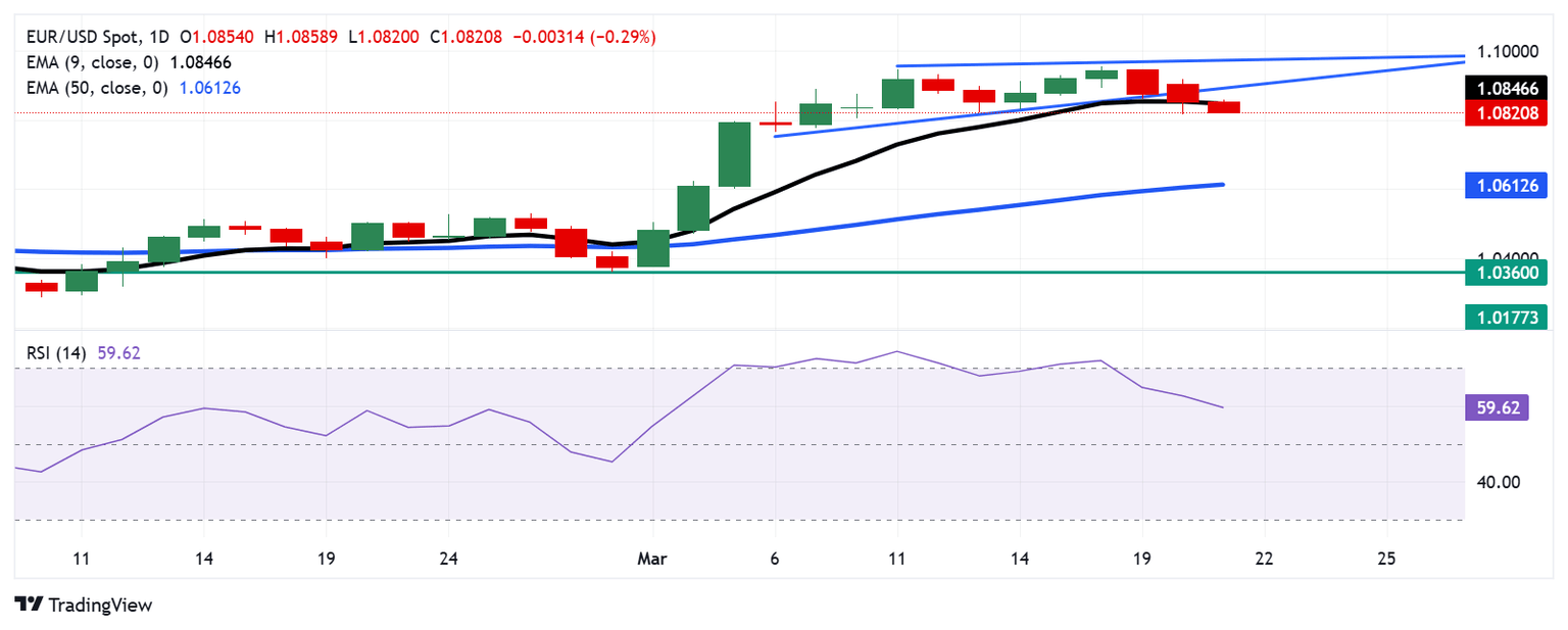 On the downside, the EUR/USD pair may target the 50-day EMA at the 1.0612 level. A break below this support could weaken medium-term price momentum, potentially extending the decline toward the six-week low of 1.0360, recorded on February 28.
