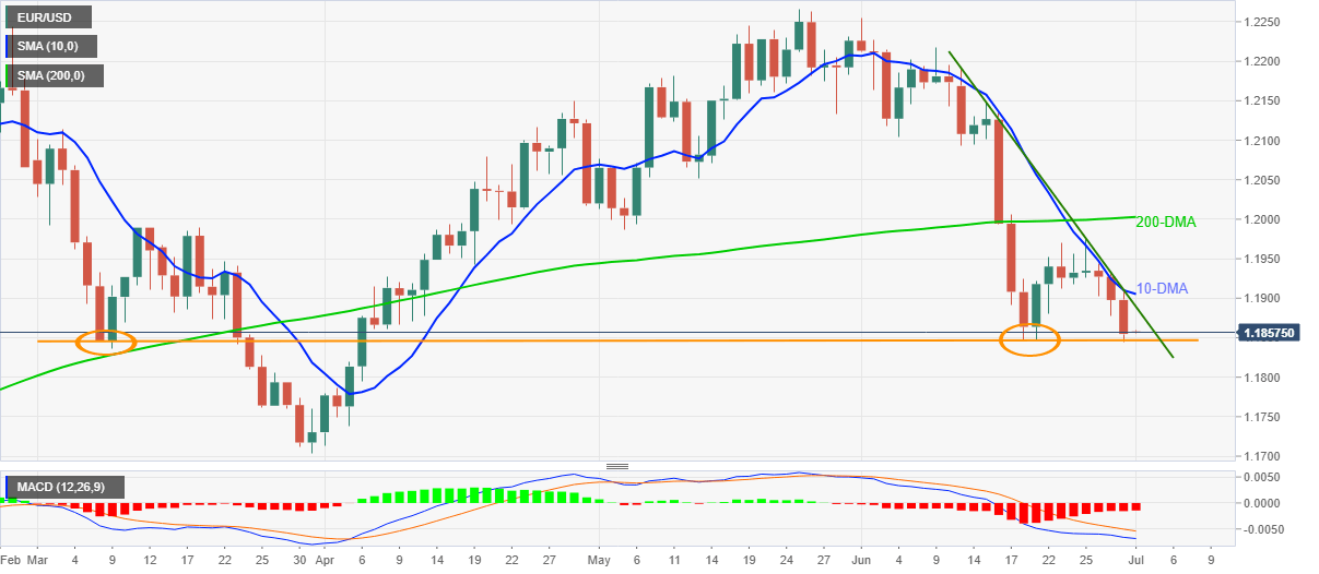 Bearish MACD and sustained trading below 10-day SMA (DMA), as well as a descending trend line from early June, keeps EUR/USD sellers hopeful.