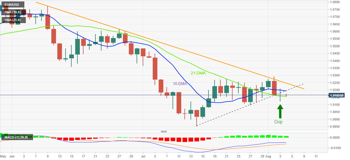 - 21-DMA, bullish MACD signals favor recovery moves targeting 1.0200 resistance confluence.