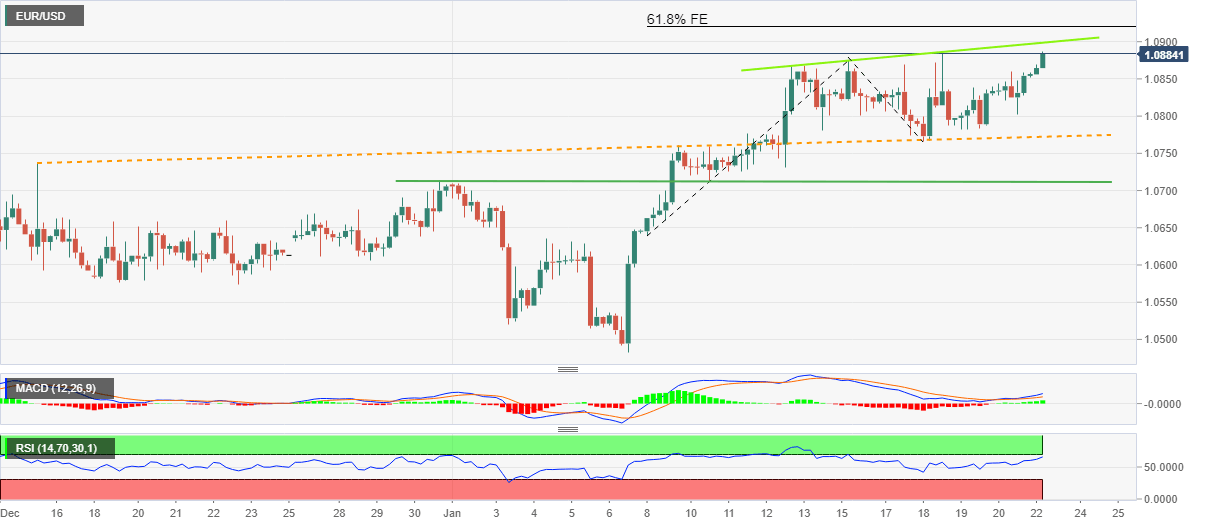 EUR/USD picks up bids to challenge the nine-month high surrounding 1.0900 as bulls keep the reins for consecutive three days to early Monday. In doing so, the major currency pair cheers bullish MACD signals while extending the run-up beyond the previous resistance line from mid-December 2022.