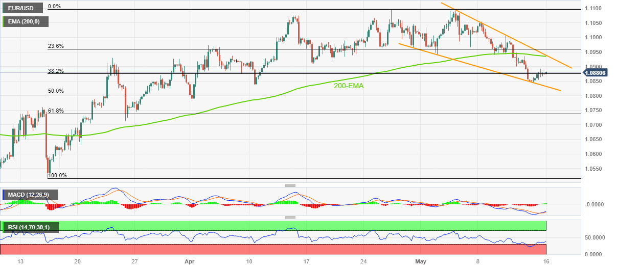 EUR/USD picks up bids to print mild gains around 1.0880 during early Tuesday as it defends the previous day’s rebound from a multi-day low ahead of the key European and the US catalysts. In doing so, the Euro pair remains firmer inside a two-week-old falling wedge bullish chart formation, bouncing off the stated pattern’s lower line of late.