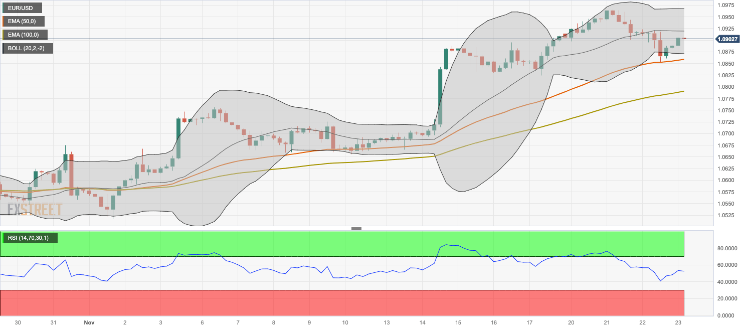 The EUR/USD pair snaps its two-day losing streak and surges above 1.0900 during the Asian session on Thursday. Traders will closely monitor the Eurozone preliminary PMI data and the minutes of the ECB on Thursday. The markets remain subdued due to the Thanksgiving day holiday in the US on Thursday. The major pair currently trades around 1.0905, up 0.16% on the day.