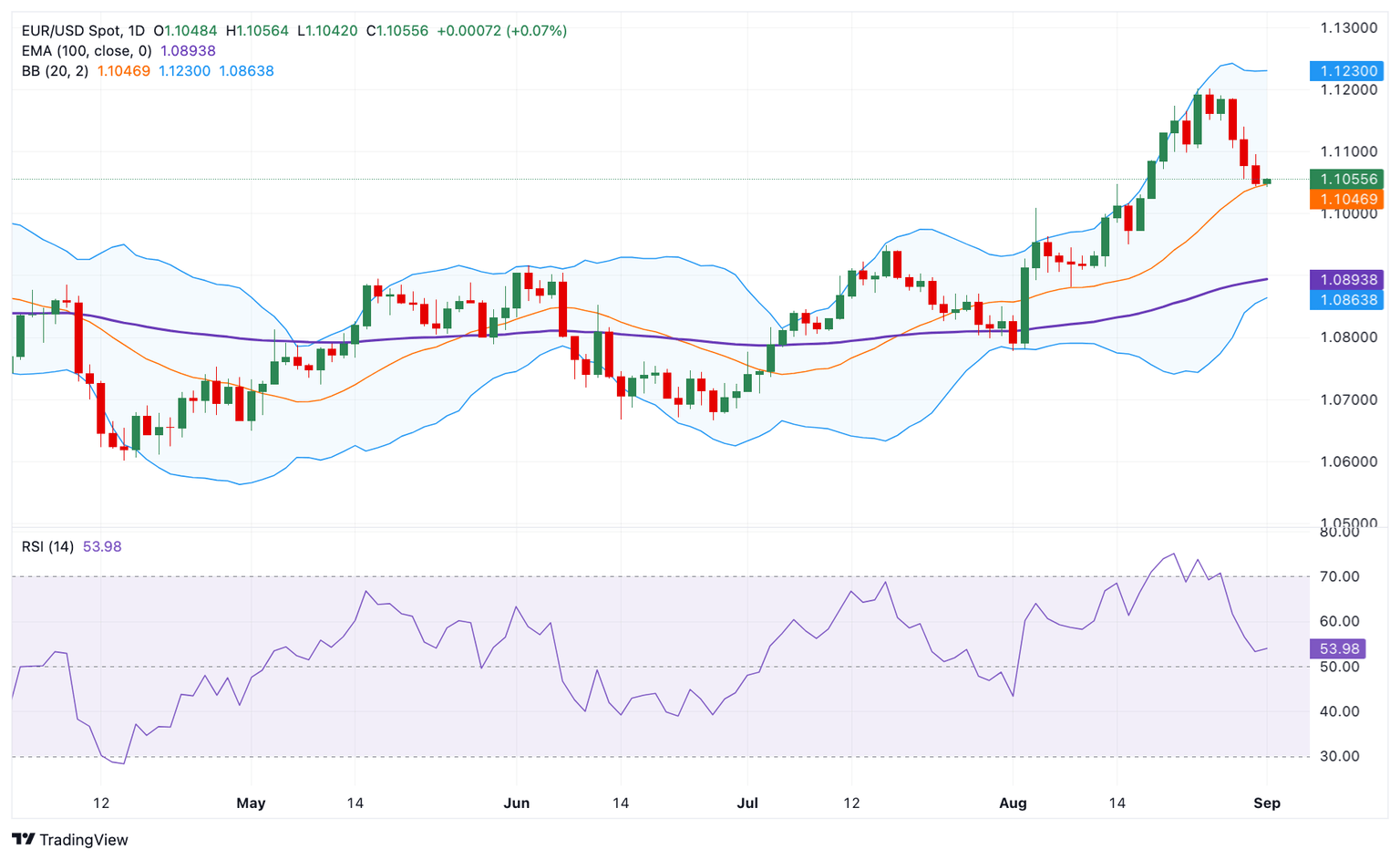 In the bearish event, the potential downside support level is located at the 1.1000 psychological mark. A breach of this level will see a drop to 1.0950, the low of August 15. The additional downside filter to watch is near the 100-day EMA at 1.0893, followed by the lower limit of the Bollinger Band at 1.0863.