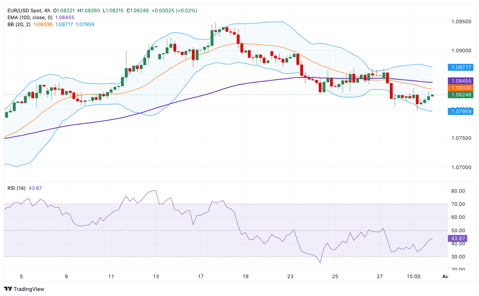 The EUR/USD pair trades on a stronger note around 1.0825, snapping the two-day losing streak during the Asian session on Wednesday. However, the upside of the major pair might be capped amid the uncertainty surrounding further rate cuts in September by the European Central Bank (ECB) after disappointing economic growth data from Germany. Later on Wednesday, the Federal Reserve’s (Fed) interest rate decision will be in the spotlight.