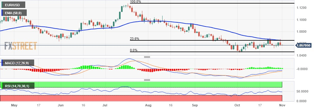 EUR/USD consolidates ahead of the Federal Open Market Committee (FOMC) policy decision with the expectation of maintaining the current interest rate at 5.5% in November’s meeting. The pair trades lower near 1.0570 during the Asian session on Wednesday.