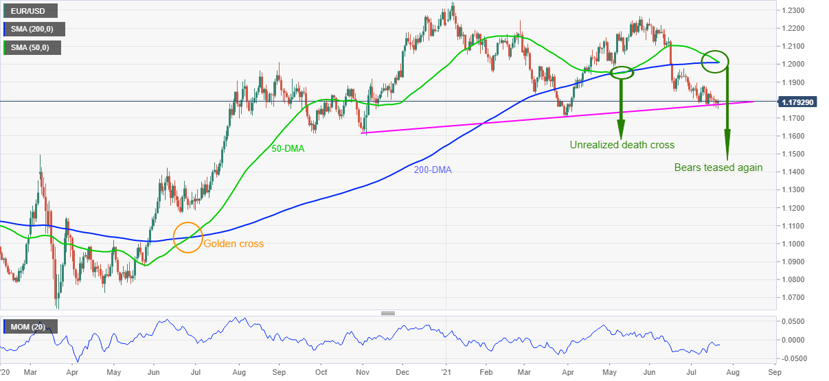 EUR/USD Price Analysis: Impending death cross teases bears around 1.1800 on ECB day