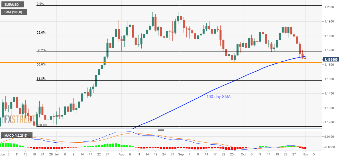 EUR/USD drops to 1.1638, the fresh low since September 28, during the early Monday. In doing so, the major currency pair respects Friday’s closing below 100-day SMA amid bearish MACD.