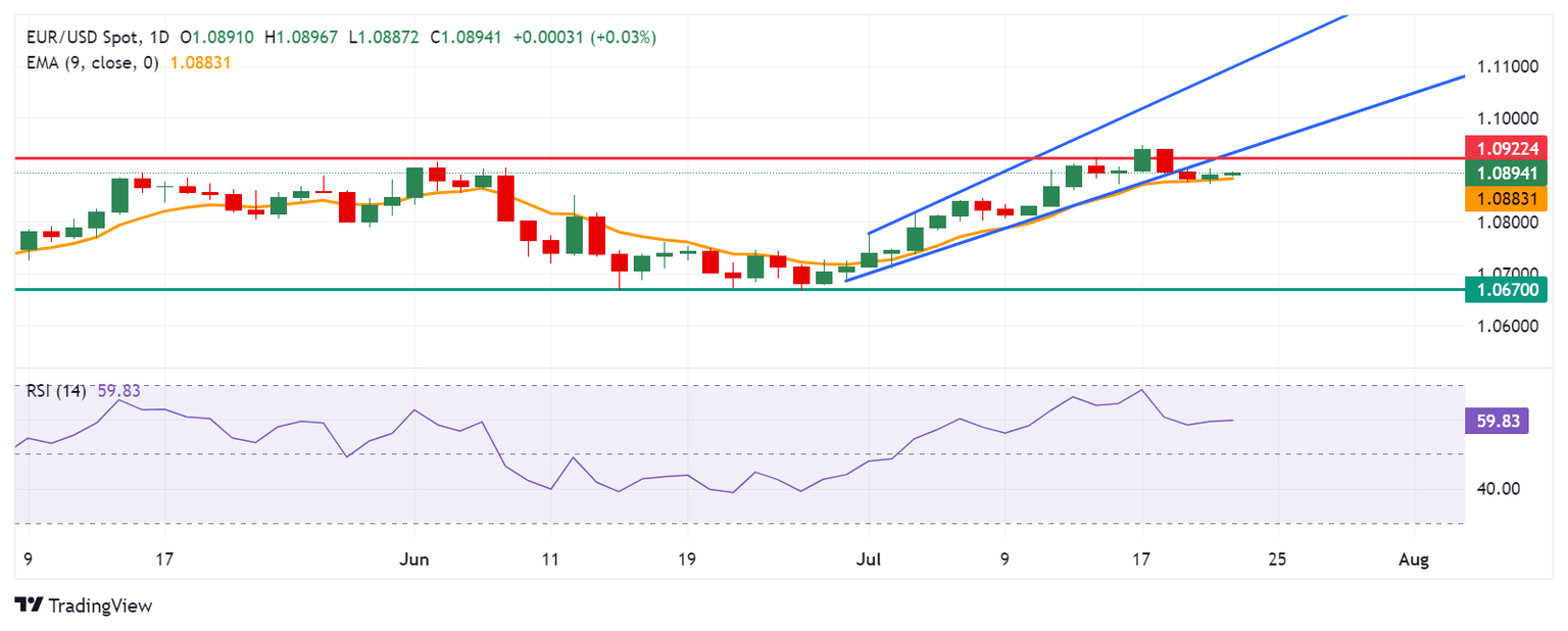 EUR/USD advances for the second consecutive day, trading around 1.0900 during Tuesday's Asian session. The analysis of the daily chart shows a weakening of a bullish trend, as the pair is positioned below an ascending channel.