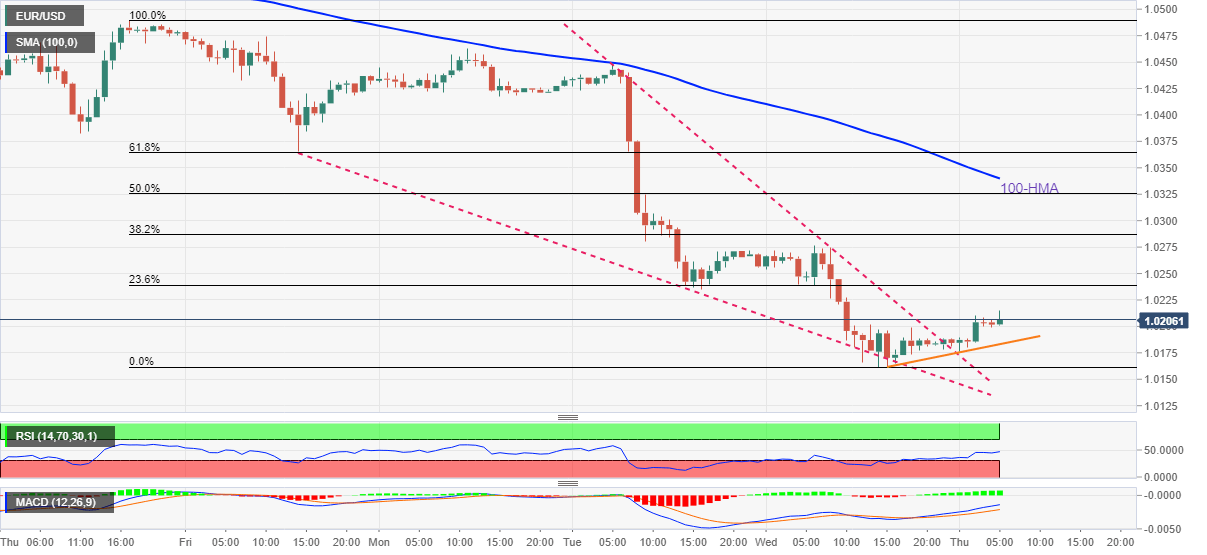 EUR/USD buyers return to the table after a four-day absence as the quote renews its intraday high near 1.0215 heading into Thursday’s European session. The major currency pair’s latest gains could be linked to the confirmation of a bullish chart pattern called a falling wedge.